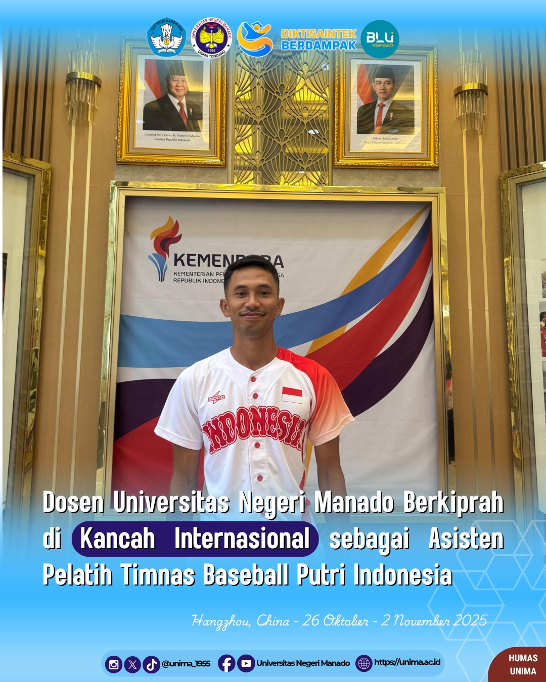 Prestasi membanggakan kembali diraih oleh sivitas akademika Universitas Negeri Manado (UNIMA). Salah satu dosen terbaik UNIMA, Gylbert GrenWino Sitompul, S.Or., M.Pd, dari Program Studi Pendidikan Jasmani, Kesehatan, dan Rekreasi (PJKR), Fakultas Ilmu Keolahragaan dan Kesehatan (FIKK), dipercaya untuk bergabung dalam jajaran Tim Pelatih Nasional Baseball Putri Indonesia sebagai Asisten Pelatih (Pelatih Fisik) pada ajang Piala Asia Baseball Putri 2025 yang diselenggarakan di Hangzhou, China.