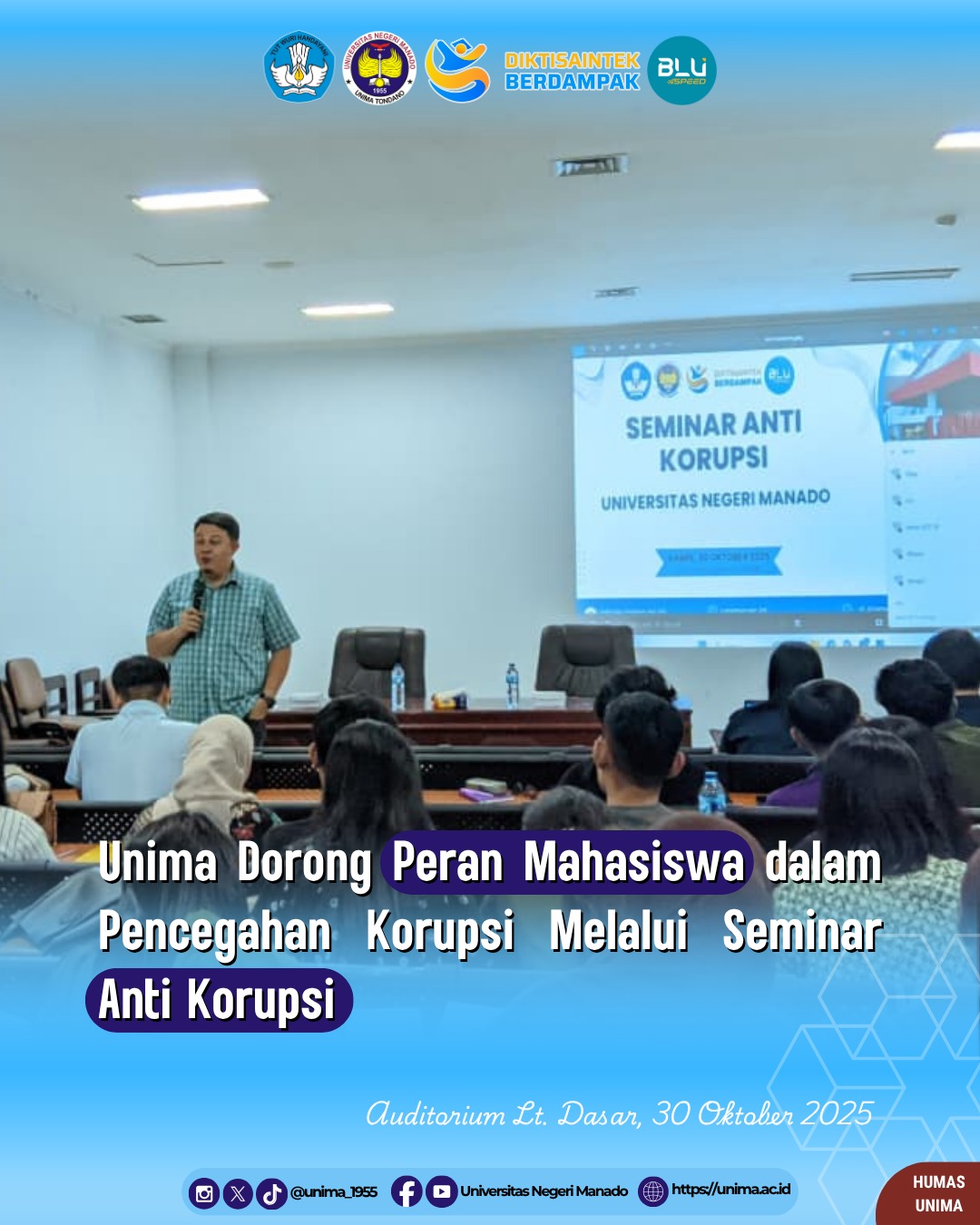 Universitas Negeri Manado (Unima) terus menunjukkan komitmennya dalam membentuk karakter mahasiswa yang berintegritas dan beretika. Hal ini diwujudkan melalui kegiatan Seminar Anti Korupsi yang dilaksanakan pada Kamis, 30 Oktober 2025, bertempat di Auditorium Maria Walanda Maramis, Lantai Dasar.