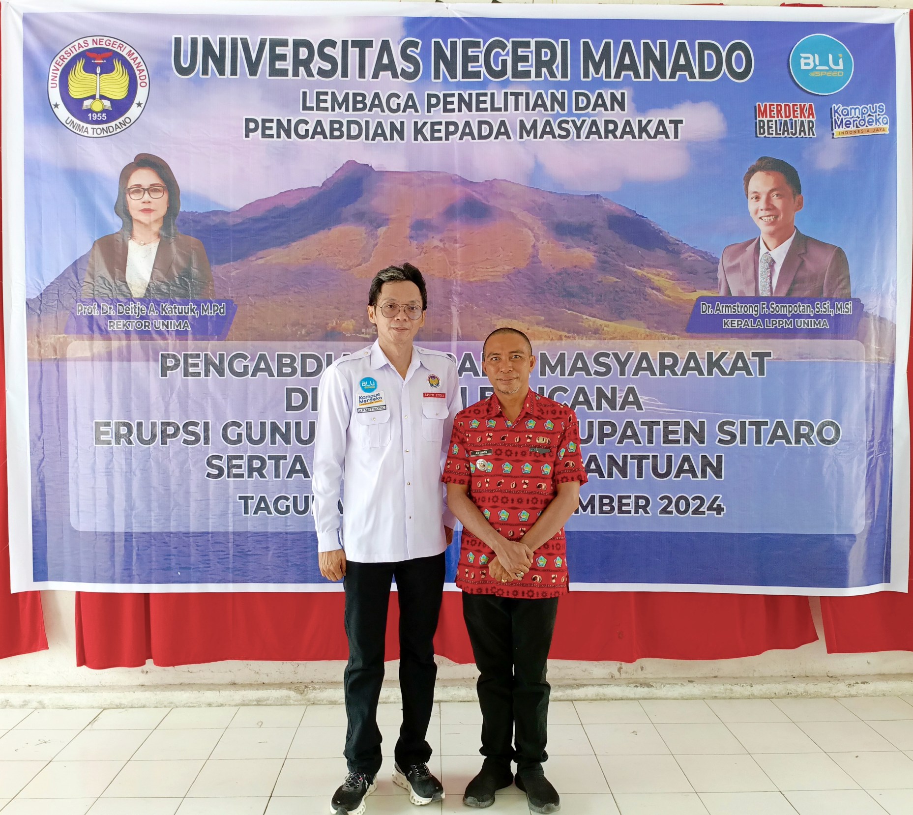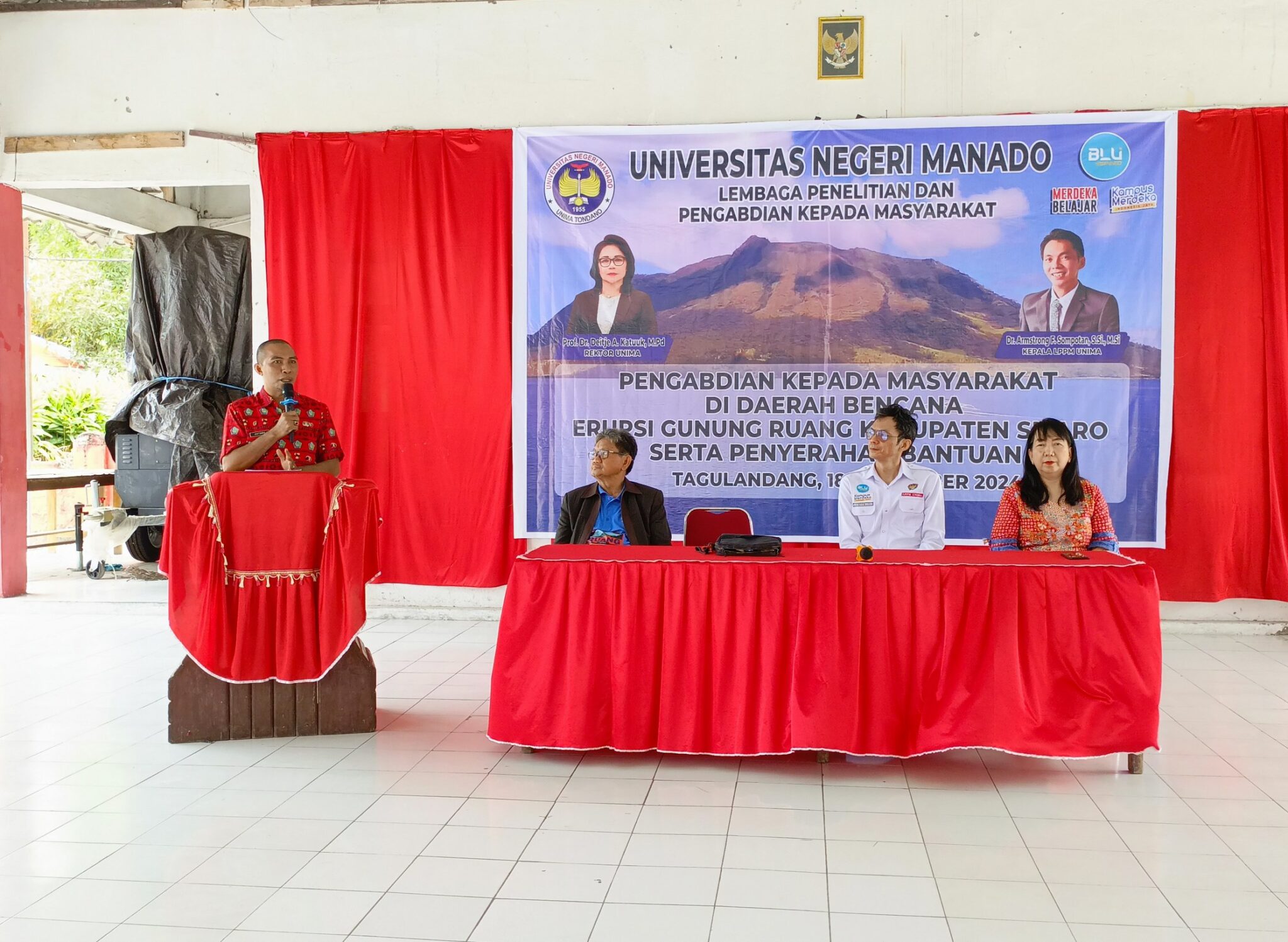 Lembaga Penelitian dan Pengabdian kepada Masyarakat (LPPM) Universitas Negeri Manado (Unima) menggelar Pengabdian Kepada Masyarakat di Daerah Bencana Erupsi Gunung Ruang Serta Penyerahan Bantuan kepada Masyarakat di Kecamatan Tagulandang, Kabupaten Kepulauan Siau Tagulandang Biaro (Sitaro).