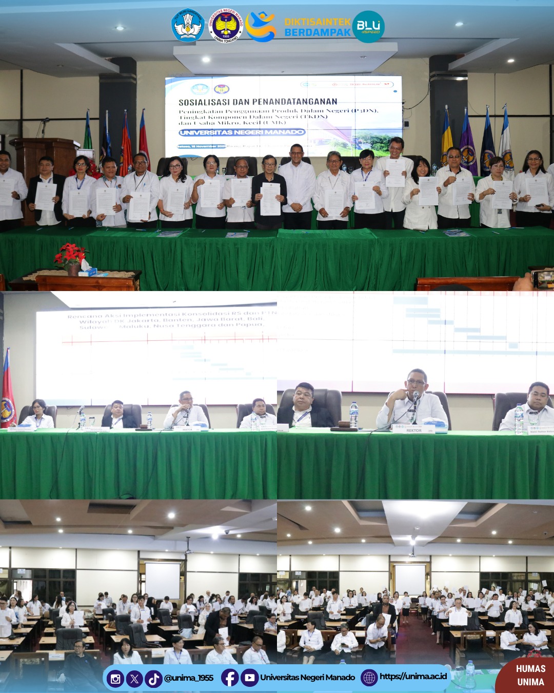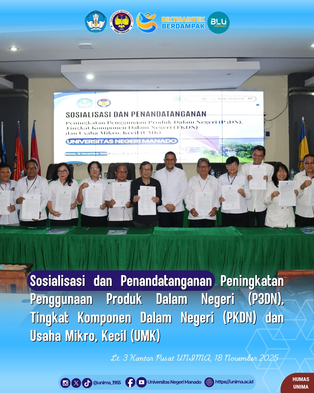Universitas Negeri Manado (UNIMA) melaksanakan kegiatan Sosialisasi dan Penandatanganan Peningkatan Penggunaan Produk Dalam Negeri (P3DN), Tingkat Komponen Dalam Negeri (TKDN), dan Usaha Mikro Kecil (UMK) pada Selasa, 18 November 2025. Acara ini berlangsung di Lantai 3 Gedung Rektorat UNIMA dipimpin langsung oleh Rektor UNIMA, Joseph Philip Kambey, SE, MBA, Ak., serta dihadiri oleh para pimpinan di lingkungan UNIMA.