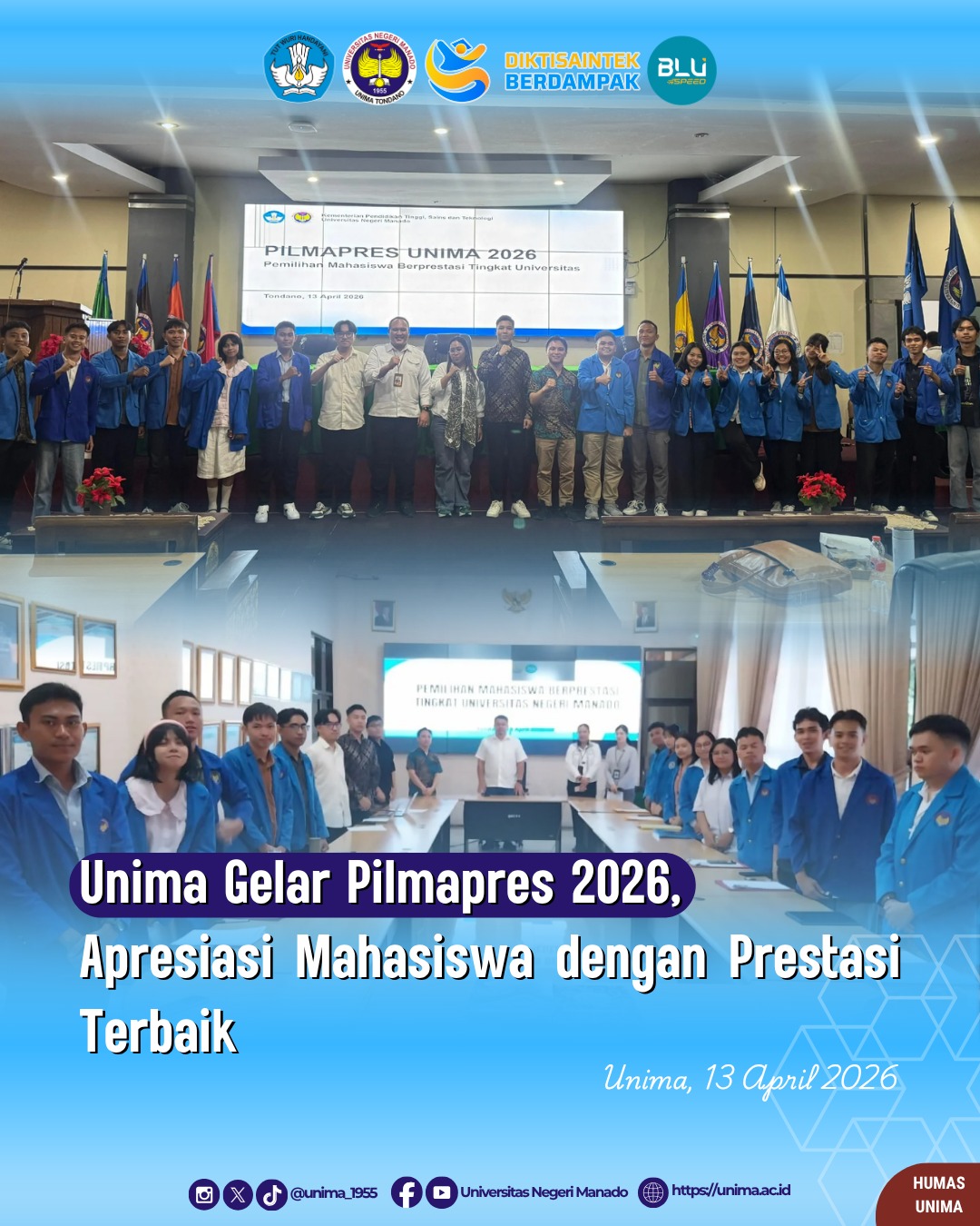 Universitas Negeri Manado (Unima) sukses menyelenggarakan Pemilihan Mahasiswa Berprestasi (Pilmapres) Tingkat Universitas Tahun 2026 pada Senin, 13 April 2026, bertempat di Kantor Pusat Unima. Kegiatan ini menjadi ajang bergengsi untuk mengapresiasi mahasiswa dengan capaian akademik, kemampuan berpikir kritis, serta kontribusi nyata bagi masyarakat.