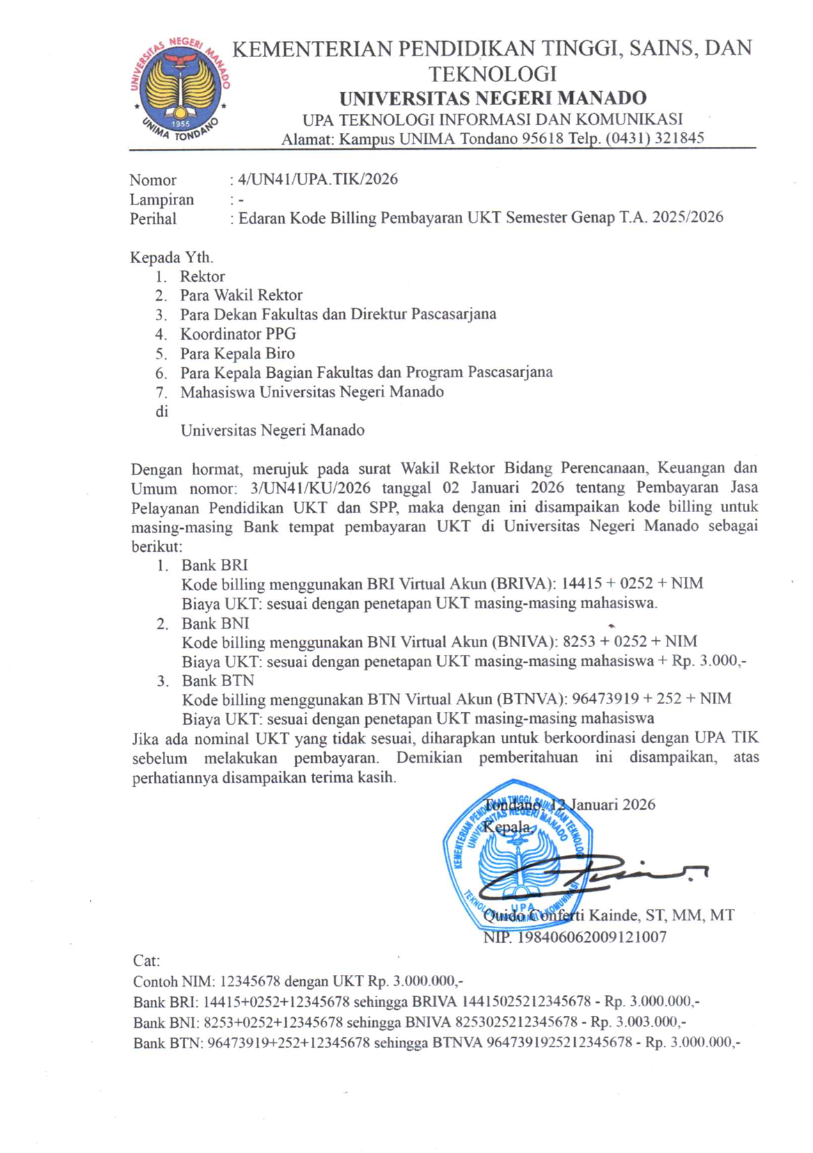 Edaran Kode Billing Pembayaran UKT Semester Genap TA 2026/2027