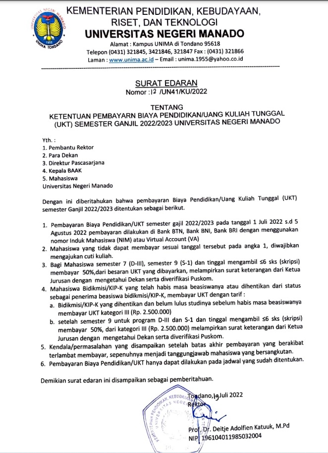 KETENTUAN PEMBAYARAN BIAYA PENDIDIKAN/UANG KULIAH TUNGGAL (UKT) SEMESTER GANJIL 2022/2023 UNIVERSITAS NEGERI MANADO 19 Juli 2022