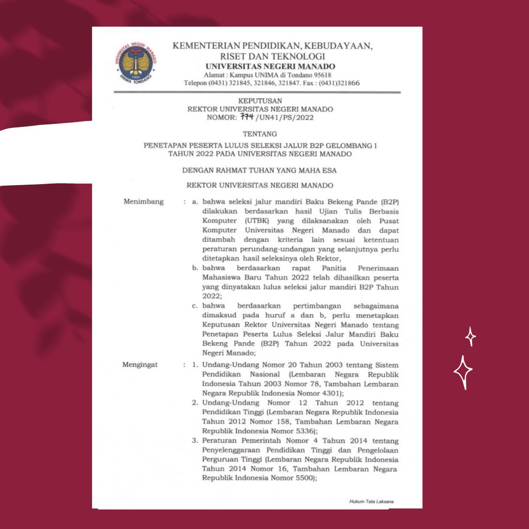 Pengumuman Hasil Seleksi Penerimaan Mahasiswa Baru Jalur Baku Beking Pande (B2P) tahap I Tahun 2022 19 Juli 2022