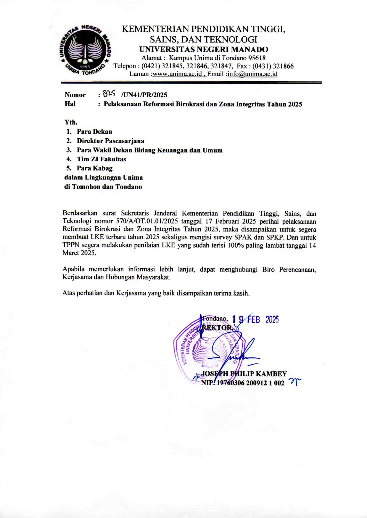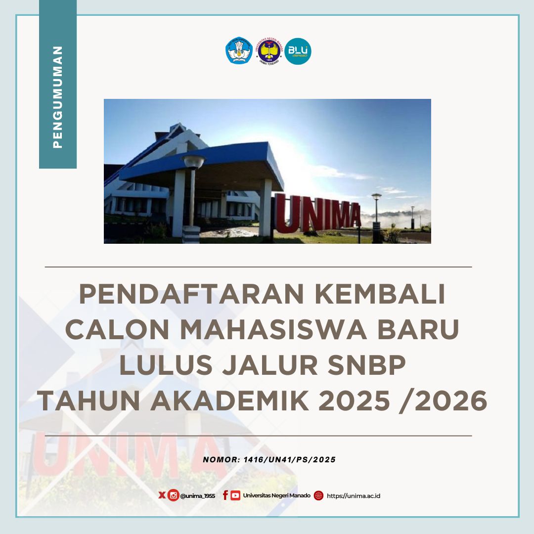 Registrasi Kembali Calon Mahasiswa Baru Universitas Negeri Manado Jalur SNBP Tahun 2025 20 Maret 2025